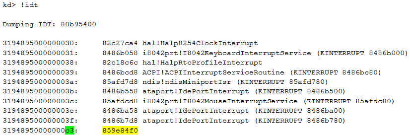 To perform this task, the rootkit developers decided to use interrupts. We can display the Interrupt Descriptor Table (IDT), as shown below. The IDT table stores pointers to ISR (Interrupt Service Routines), which are called when an interrupt is triggered.