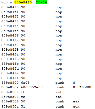 The last argument of the WinDbg command is the length (L0x16) to disassemble. The function starts by a series of NOP. The interrupt 0xC3 is used by the malware, the next step is to identify how and when this interrupt is triggered. Here is the code of the beginning of the function IoCreateDevice():