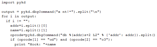 We can see that the second instruction is int 0xC3 (interrupt 0xC3). Thanks to the PyKd extension, we can easily create a python script to detect every function with this interrupt: