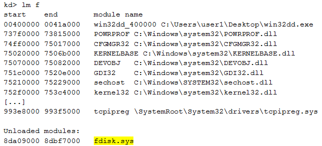 We can now display the loaded (and unloaded) modules with WinDbg: