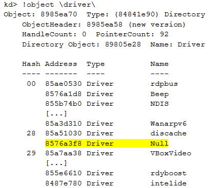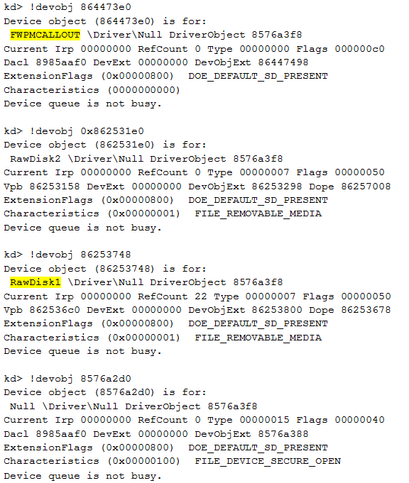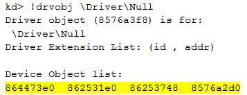 The driver used by our module is \driver\Null. All other modules are legitimate modules used by Windows. We can display the devices associated to the driver we are focusing on: