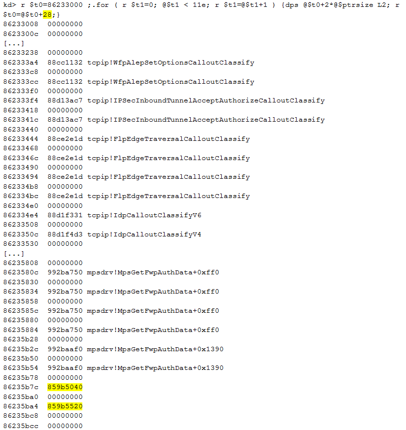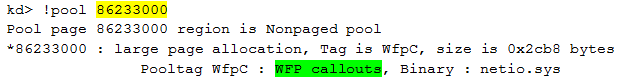 The list of elements reminds us of the information we have seen in the IDT: two addresses are not resolved. Those two WFP callouts are: 0x859b5040 and 0x859b5520. WinDbg is not able to resolve these two addresses because the addresses are unknown. These are not addresses of a Microsoft. Now that we have the addresses, we can use the command !pool to validate that the addresses are in the same region as the code executed when an interrupt is triggered: