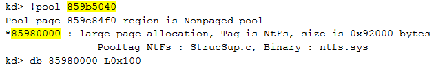 - First, the driver uses a well-known Windows kernel memory pool tag called "NtFs". The Windows components mark allocated memory block with a unique tag. But the rootkit uses the same tag as the legitimate ntfs.sys driver. This choice was made to hide the rootkit and dupe the analyst.