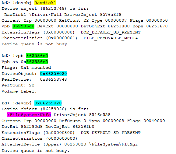 Previously, when looking at the device objects, we came across two devices with very similar names: RawDisk1 and RawDisk2. Let us have a detailed look at the first one: