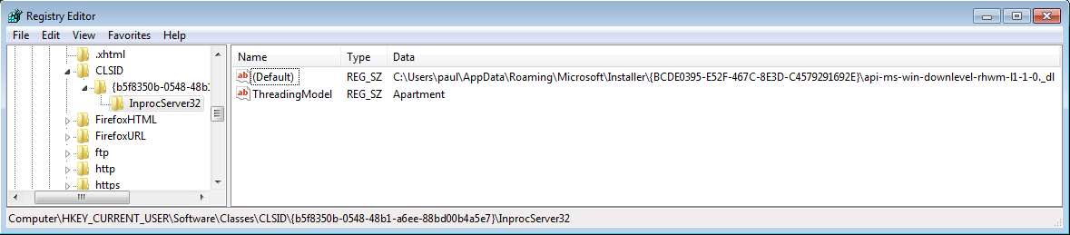 - HKCU\Software\Classes\CLSID\{b5f8350b-0548-48b1-a6ee-88bd00b4a5e7}\