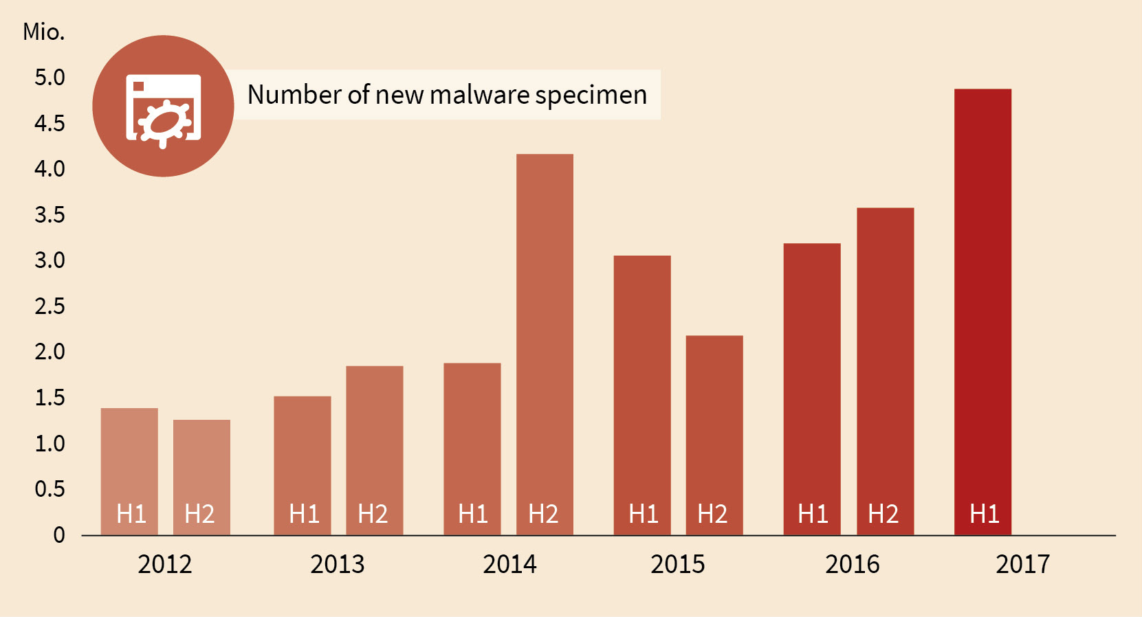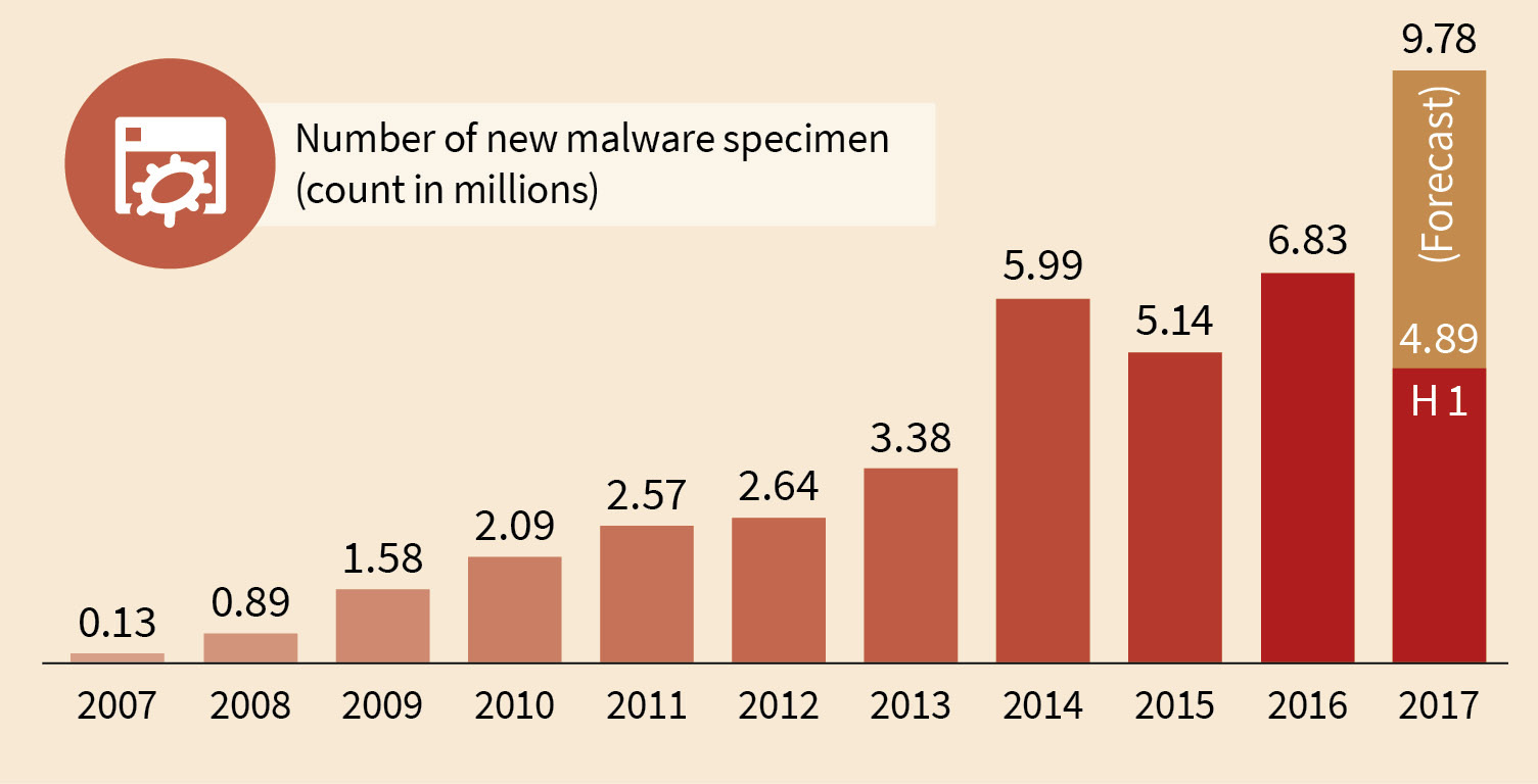 The numbers of the first quarter of 2017 gave indicated it already. The number of new malware specimen is increasing. Even after 30 years of statistics about viruses and malware this trend persists. 10 years ago we counted 133,253 new malware specimen (which was 3 times the number of the previous year). This number is with the current amount of new malware reached after 4 days. In 2012 the number rose to 20 times the amount compared to 10 years ago. And the numbers keep rising with variation but consistently throughout the last years. During the second quarter of 2017 the number of new malware specimen climbed to the 1.6-fold of about 3million. The first half year brought us 4,891,304 new malware specimen. In other words. Every day there are more than 27,000 new malware specimen. On average every 3,2 seconds. Even compared to the share of historic data this is a tremendous share. Every fifth malware specimen that we have ever seen, was created in the first half of 2017. If it goes on like this we will end up with almost 10 million new malware specimen in 2017.