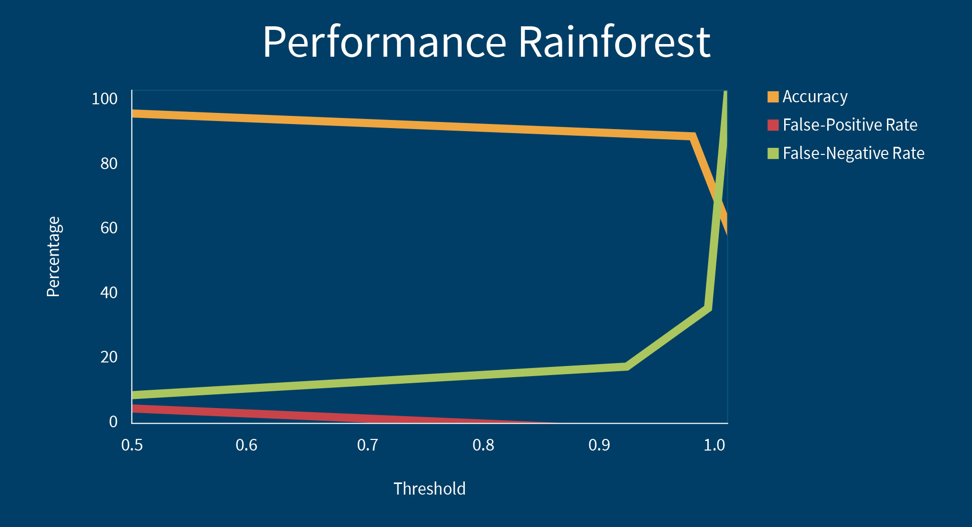 With a view of the actual classification, the machine learning algorithms calculate a probability of the URLs being a phishing URL. When classifying URLs normally, all URLs with a calculated probability greater or equal to the threshold of 50% are classified as phishing URLs. But it is also possible to increase the threshold to let's say 90% for example. Then all URLs which are phishing URLs with a probability of 90% or above are classified as phishing URLs. All URLs which contain a probability below 90% are classified as benign. Increasing the threshold, makes sure that the classifier makes less mistakes and classifies less URLs as phishing URLs which are in fact benign (so-called False Positives). Unfortunately due to the increasing of the threshold, the number of URLs which are phishing URLs but are not classified as phishing URLs (so-called False Negatives) is increasing, too. The adjustment of the threshold is therefore a trade-off between false alarms (False Positives) and missed detections (False Negatives). We analysed the four different machine learning algorithms with regard to a good scalability of the false-positive rate to the threshold and got good results when looking at the Rainforest algorithm. These results are illustrated below. As expected, the false-positive rate falls at the cost of the false-negative rate.
