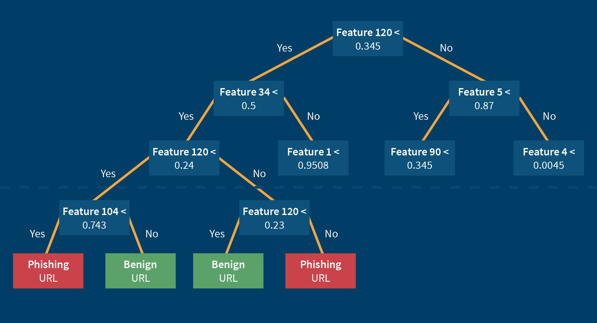 It is possible to visualize a decision tree, which contains a found number of rules, which are used to decide if a website is a phishing website or a benign website. The tree consists of a set of nodes, at which certain questions are asked. In the case of answering a question with “Yes”, one forks to the left, in the case of answering a question with “No”, one forks to the right. Each question has the following structure: Feature x < value ? When starting at the top of the decision tree and answering the questions one after one, we eventually get to a node in which the classification label of the URL to check is contained. In the learning process, the features which divide the learning set of URLs best into the two classes phishing URL and benign URL are arranged at the upper part of the tree. The features which divide the learning set worse or which are based on a complex presorting are arranged in the lower area of the decision tree. As you can see in the figure above, certain features (e.g. feature 120) can be questioned more than once in the path of the decision tree. The best values of the nodes, which determine how to branch, are calculated in the machine learning process. The machine learning of the decision tree algorithm hence optimizes the order and the rule sets in order to classify most URLs of the training set correctly.
