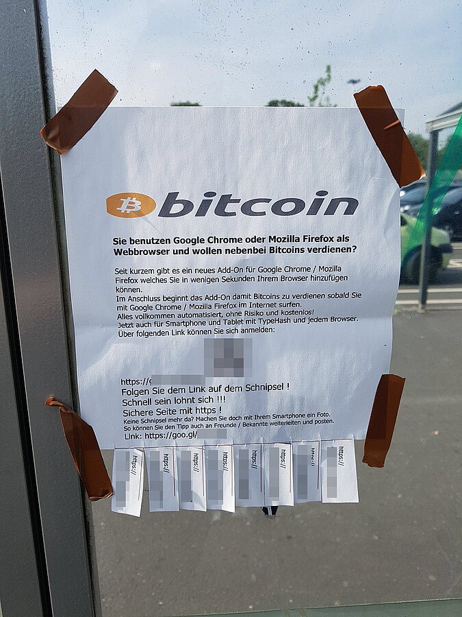 We usually receive malicious and suspicious files or web links via email. In this case, the submission consisted of a photo which showed an "ad banner" printed on paper. It advertised mining cryptocurrency using a browser. The use of browser plugins is not a new invention. What is new, though, is the fact that this method is advertised "offline", outside the internet. An alert reader of our blog sent us the picture, asking us to take a look at what was going on there. Naturally, with us being curious by nature, we could not resist.