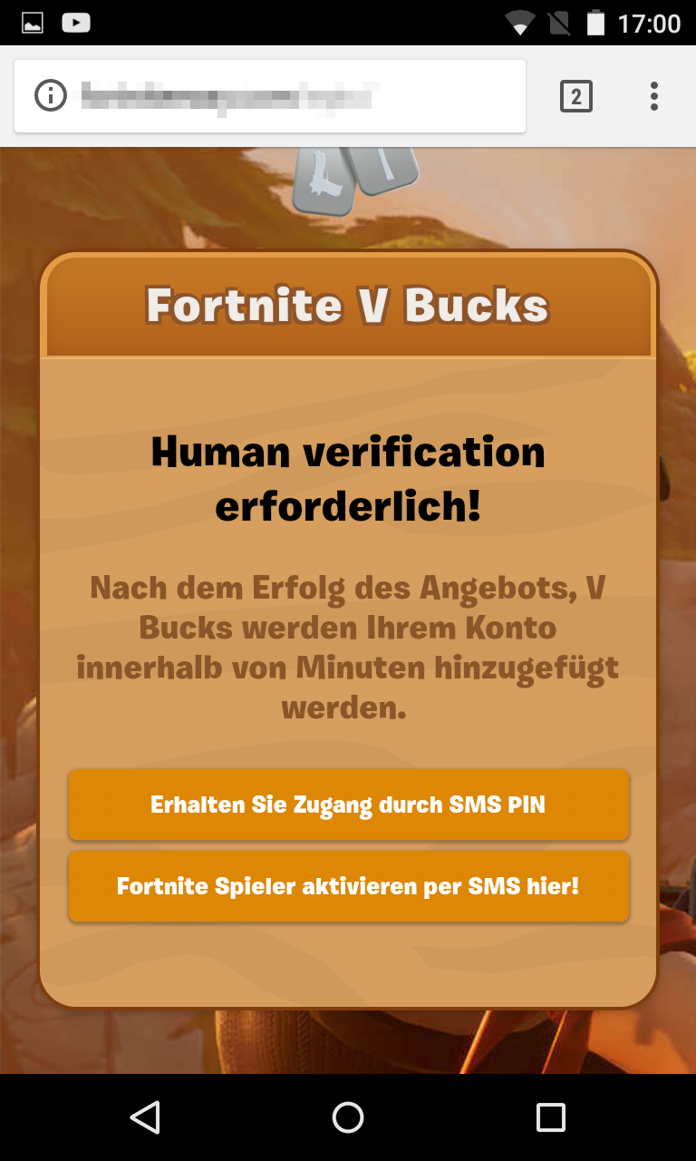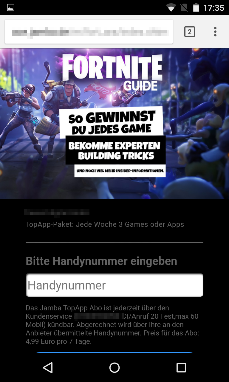 Scam 1: Fake sites pretend to belong to the developers and offer supposed Fortnite apps. Users are asked to enter their mobile number on these websites. In the small print it says that the users are agreeing to an SMS subscription for three to seven Euros a week. In one example, no fewer than three subscriptions were agreed at the same time.
