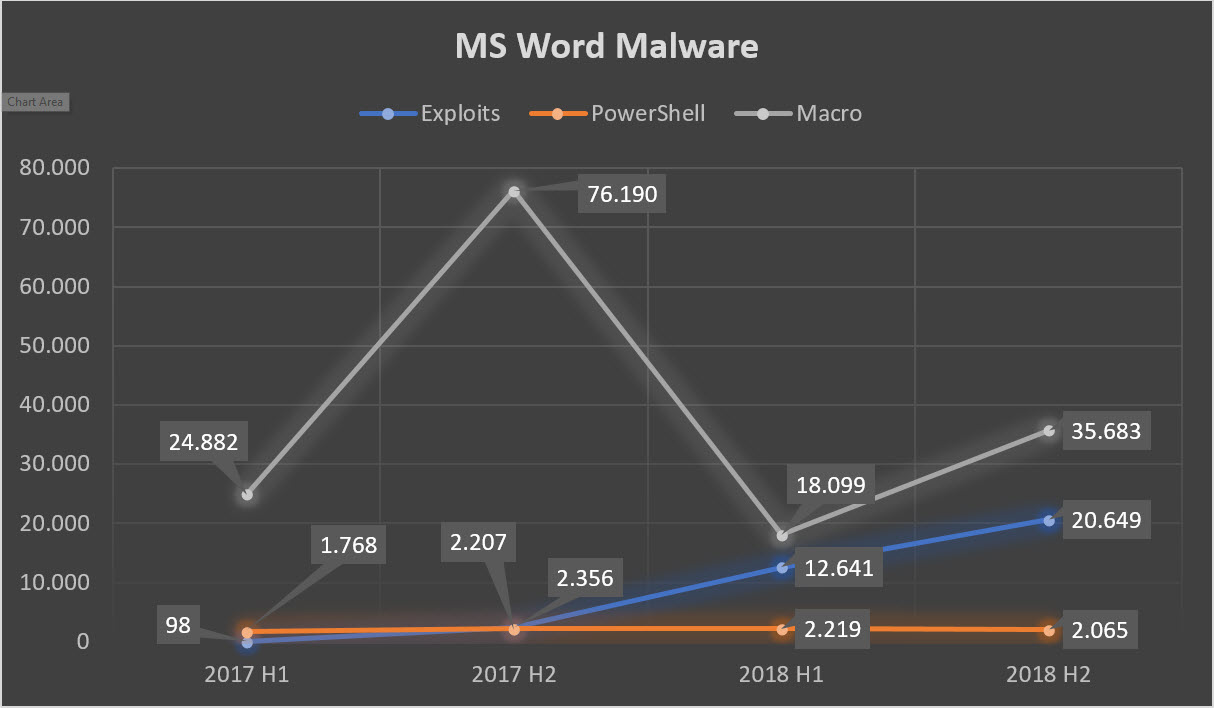 Malicious macros still lead the pack of common techniques used in Office documents despite having experienced a steep drop between the last half of 2017 and first half of 2018. Given that macros are disabled by default (as of Microsoft Excel 2007) and that tricking victims into re-enabling them is difficult, malicious actors are moving away from traditional macro-based attacks towards other, more potent techniques. This can be seen in the steady increase of Exploit and PowerShell based attacks with a 99 percent increase of Exploits from 98 in the start of 2017 to 20,649 by the end of 2018 (See Figure 6).