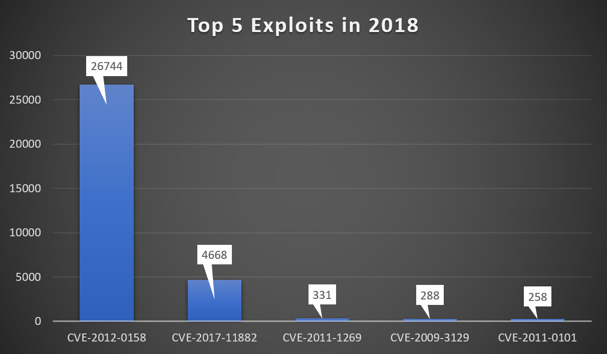 We will only discuss the top two exploits presented here, which are CVE-2012-0158 and CVE-2017-11882, since the first is a 6-year-old vulnerability while the other is a quite recent vulnerability.