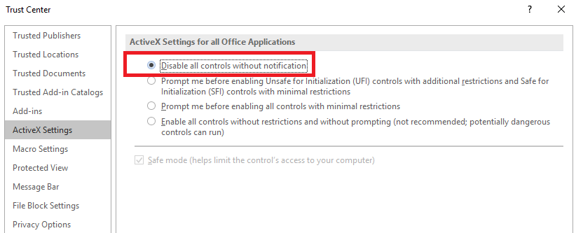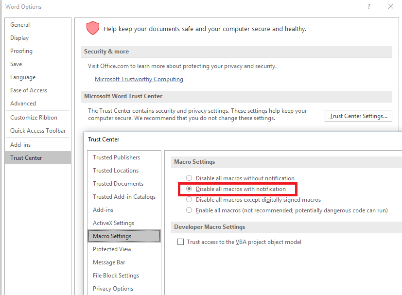 - Macros, ActiveX, Fonts, Formula Editors and Codecs should not be activated if they are not needed. These features can be deactivated with Trust Center which can be found by navigating via Options -> Trust Center. Disabling Features through Trust Center can be done across Microsoft Office Products such as Excel and PowerPoint.