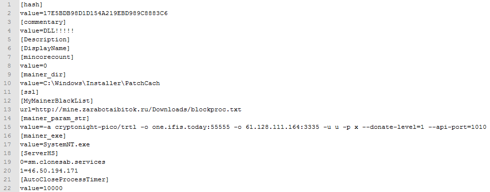A file named parameters contains the settings for the coinminer malware.
