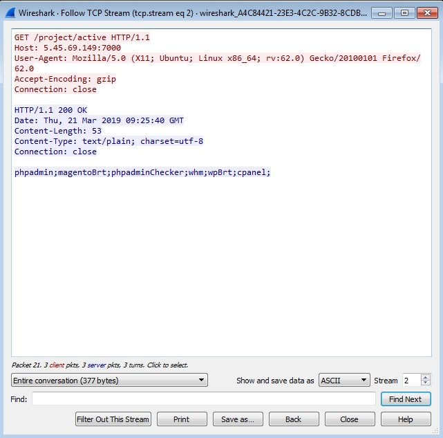 Second connection request: The HTTP request below shows that the trojan connects to the c2, which returns a list of service types the infected machine should perform brute force attempts on.