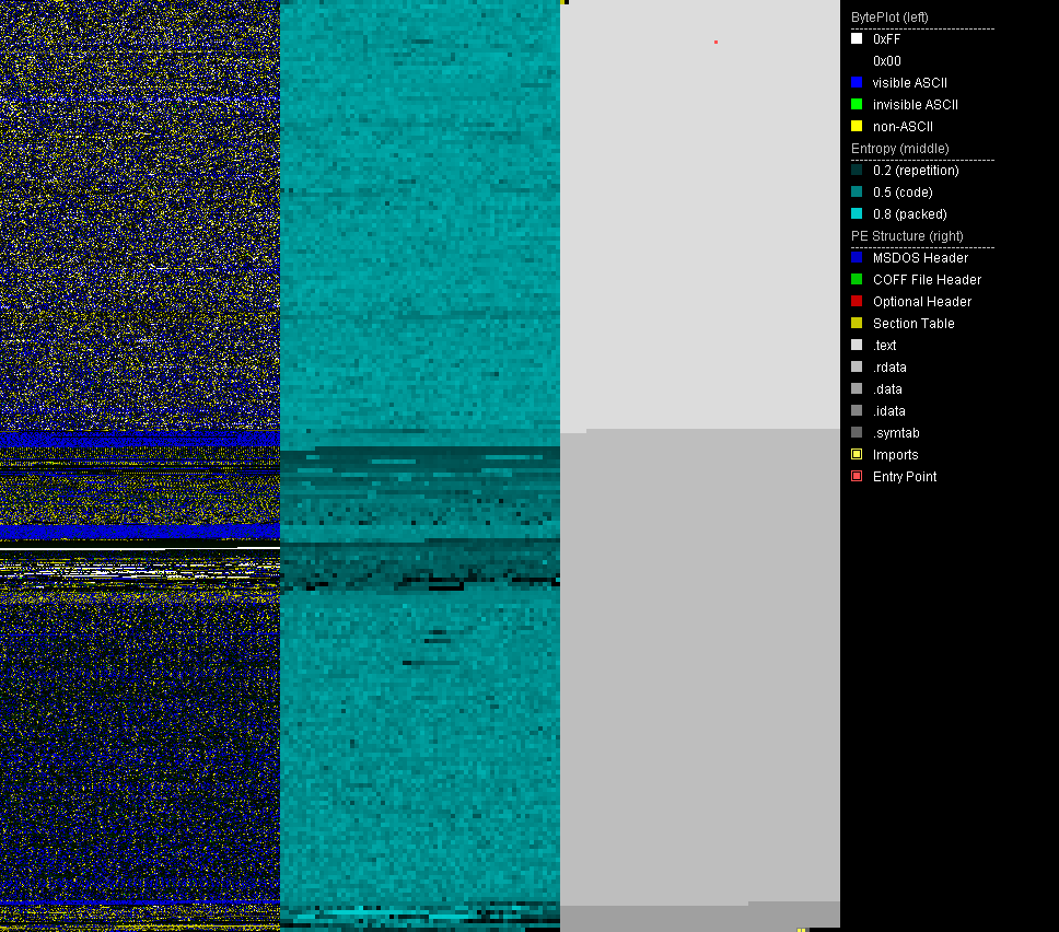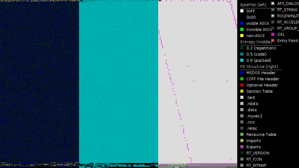 The file uses a UPX packer. After unpacking the sample, the PortExAnalyzer presents the structure as shown below. The exports, represented by the pink squares, are fragmented and strewn across the entire file, whichin and of itself is very unusual for an executable. The high number of export symbols and invalid exports cause some debuggers to crash, for example older versions of x64dbg. Whether or not this is intentional on the part of the author is anyone's guess, but maybe it is a crude method of analysis evasion. As the entropy is high, the sample is likely not fully unpacked yet. The mostly turquoise color in the mid section is indicative of this.