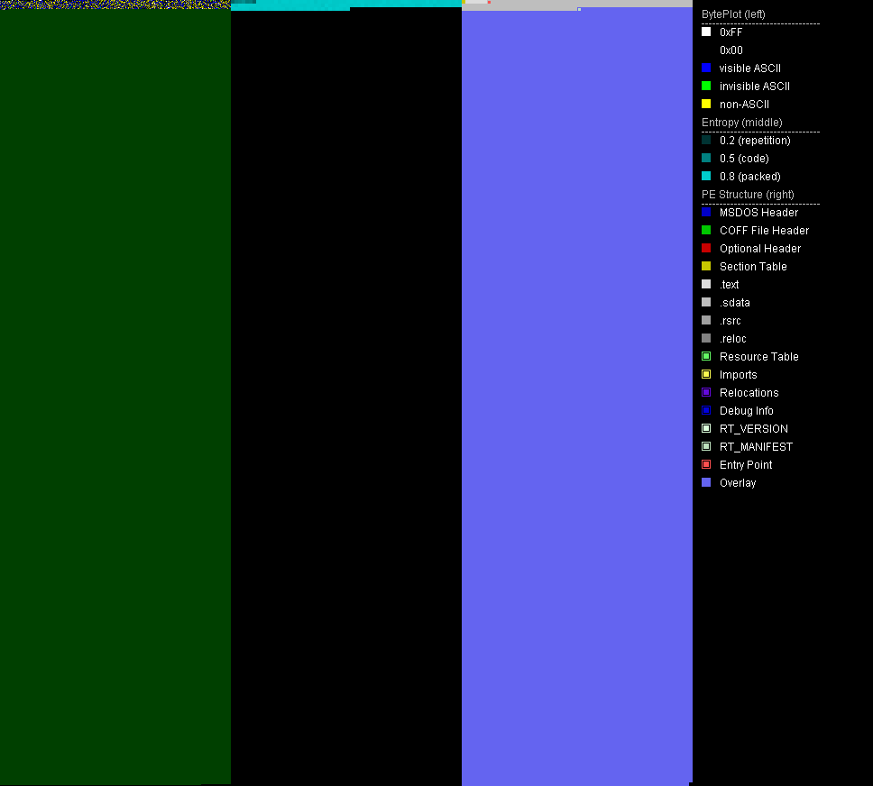 Some malware samples are big in size because they have been bloated artifically. This happens usually by appending zero bytes to the file. The most common Windows malware executable format, the Portable Executable Format, does not care about appended data. It will not be mapped to memory and is called overlay in this context. Malware may also bloat the last section or other areas of the file but overlay seems to be the most common. The bloat is well visible in file visualizations. The sample[1] below has been bloated with space characters in overlay.