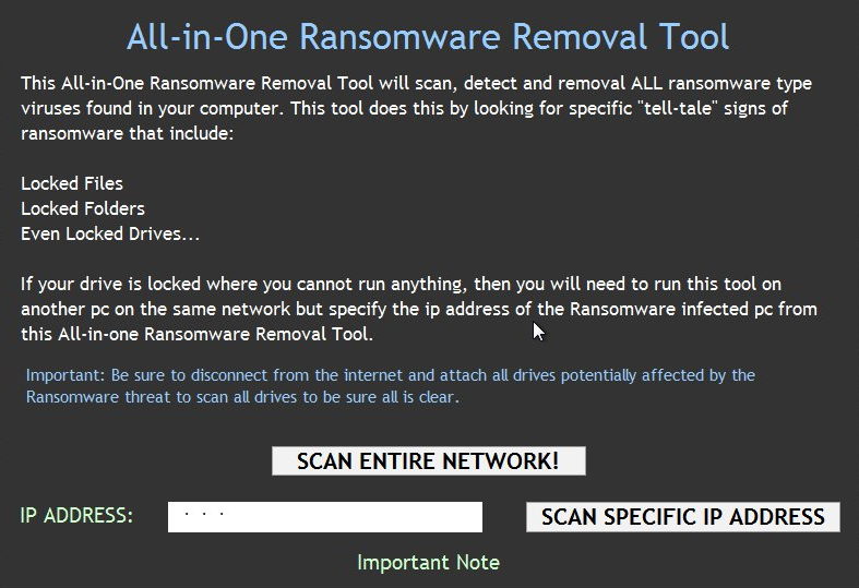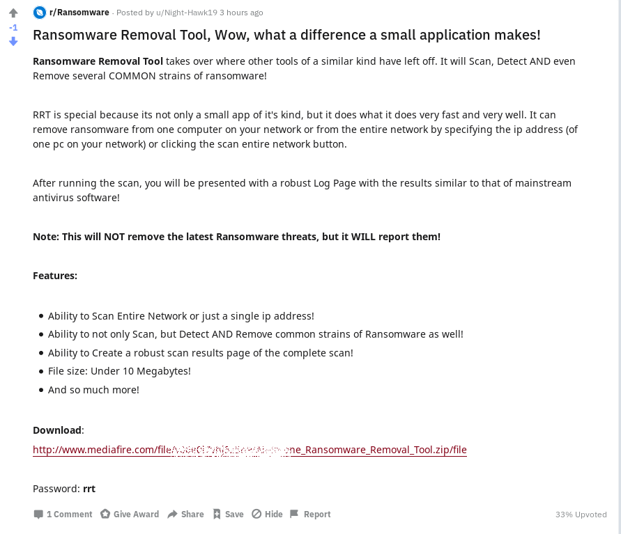 The Ransomware subreddit is a place where users frequently ask for assistance after their systems got infected by ransomware. One poster promised a solution for everyone by advertising a free "Ransomware Removal Tool"[3]. They provided a mediafire download link to a password protected archive that contains the tool. The advert claims the tool will remove all common ransomware infections from the system and the entire network, except for the latest ones.