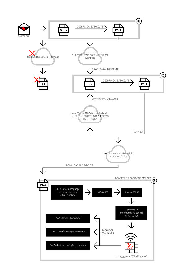 The latter of which was the latest URL as of writing, where the JS decryptor/loader and PowerShell backdoor scripts were completely updated. The CNC server domains were updated during analysis (e.g. hxxp://green.4107irishivy.info/ to hxxp://green.4107irishivy.info/), making this campaign difficult to detect.