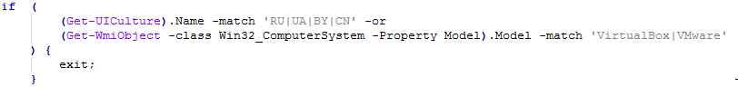 The first part of the code consists of evasion techniques. The backdoor will first try to check if the infected system’s language is Russian, Ukrainian, Belarusian, or Chinese, and if the system is running under VirtualBox or VMWare (suggensting it is analyzed in a virtual environment - a technique often employed by malware analysts), terminating the execution if either check is matched:
