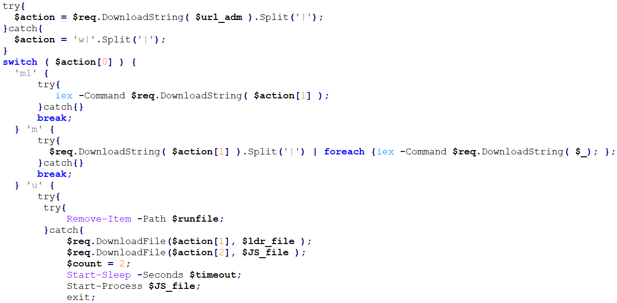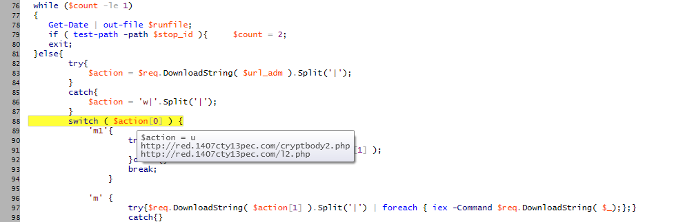 For the m1 and m commands, the URL being downloaded will contain the PowerShell script to be executed for its malicious activity.