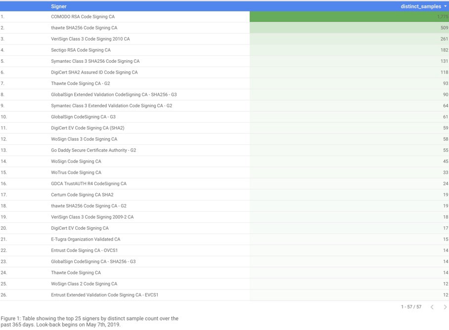Researchers from Chronicle collected data from VirusTotal reaching over a time span of 365 days to find out which CAs had be abused the most.