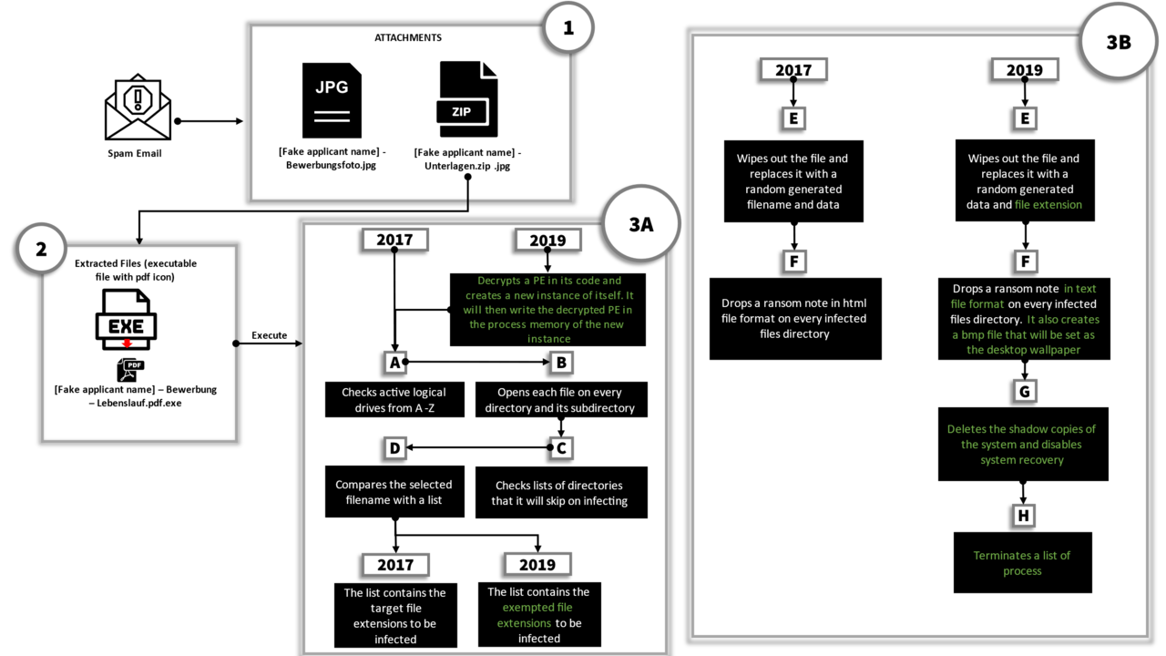 Ordinypt is a wiper, disguised as a ransomware. It deletes the user’s files and replaces them with files containing random data to make the remaining data look like it is encrypted. This means there is no way that files affected by the ransomware can be restored even after paying the ransom. The malware was first seen in 2017, also targeting German companies and using the same technique of social engineering. While the two variants have similarities, the newer version of the malware is different in terms of the extent of its damage to the user’s machine.