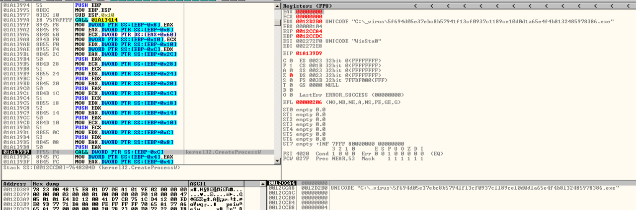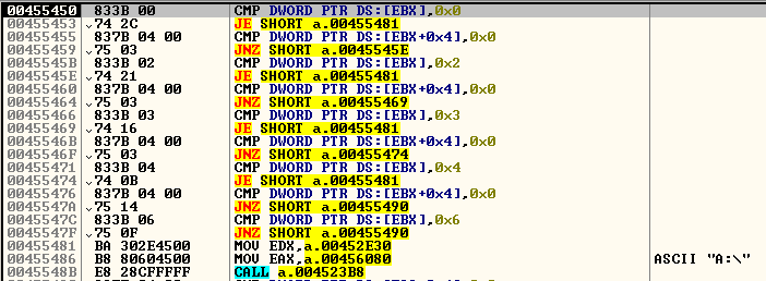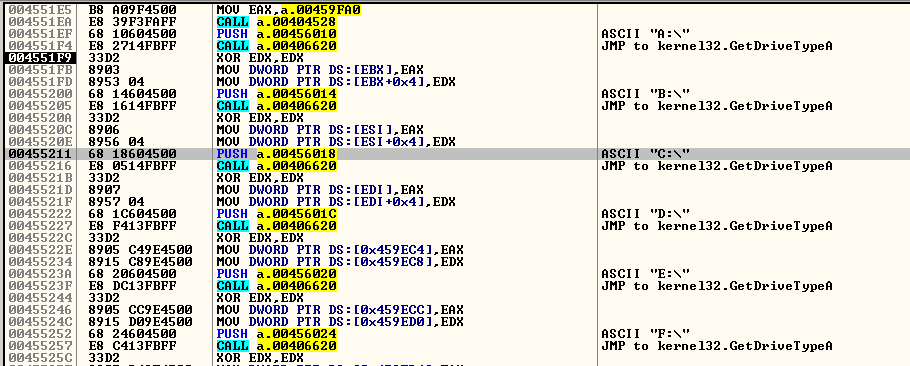 In the new process it will create a random string with a length of 5 bytes. This random string will be used later as the extension name of the files it will drop. It will then check for the drives in the system by iterating from A:\ to Z:\, looking for certain drive types to infect which are either unknown, removable, fixed, or remote drives.