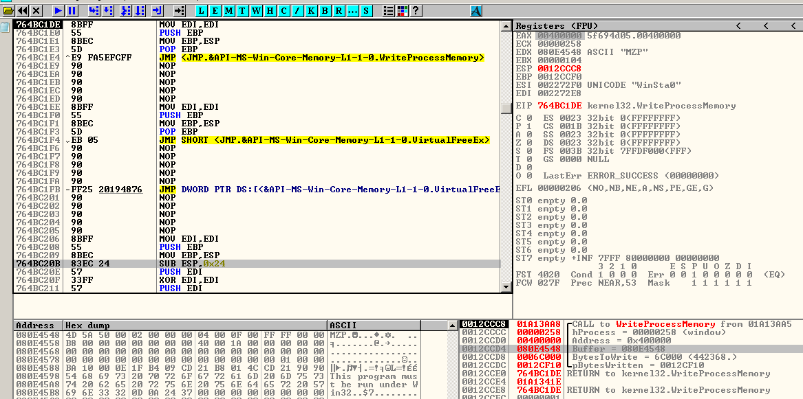 Upon execution of the file “Britta Ludwig – Bewerbung – Lebenslauf.pdf.exe”, the differences between the old and new versions of Ordinypt will become apparent. In the 2017 version, it will immediately attempt to run its payload. In the 2019 version however, it will first decrypt a PE file in its code and then create a new instance of itself. Following this, it will inject the decrypted PE into the new instance of itself. This is a commonly used technique to avoid analysis, making it harder to reverse engineer the malware and create signatures that will detect the file.