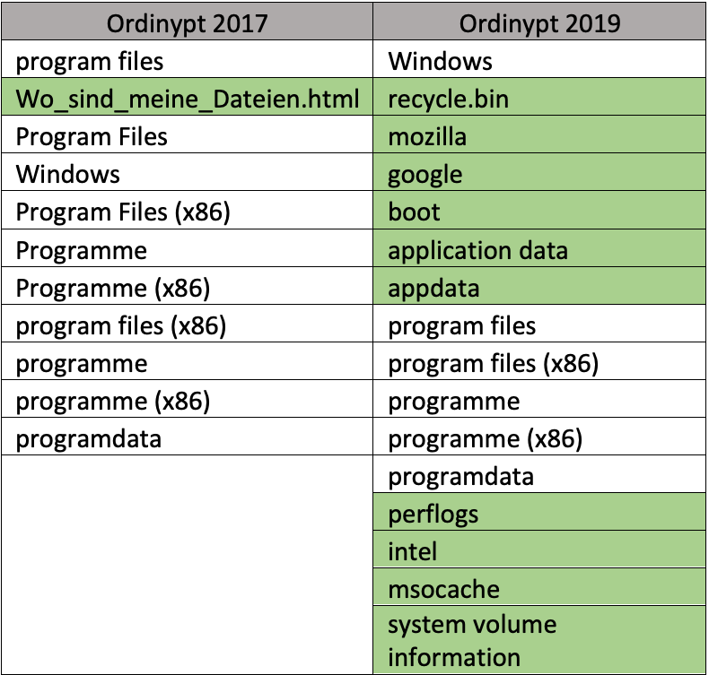 If a drive belongs to those drive types, Ordinypt will iterate all the files and directories inside the drive. Like what it has done to the drives, it will also look out for some criteria in the files and directories. It will skip certain directories based on folder name, with the differences in new and old versions of Ordinypt highlighted in the table on the right.