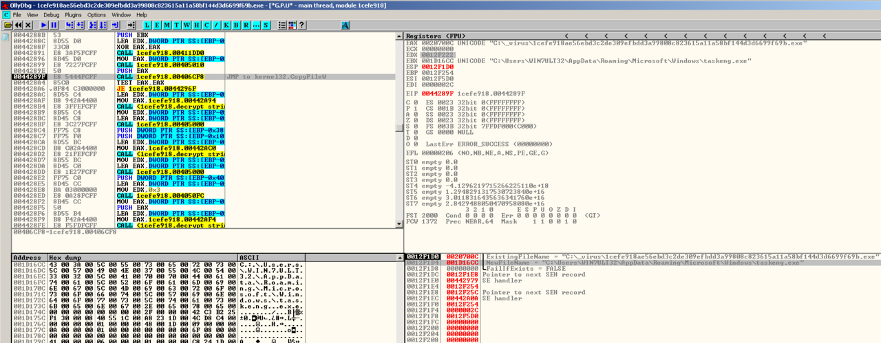 Compared to Buran, which just creates several instances of itself, Zeppelin drops an executable file inside the %APPDATA% directory with a filename randomly chosen from a list of possible names. To ensure its persistence, it adds an autorun key to the registry that points to the path of the dropped file. The dropped file is a copy of itself which will be executed by using the “Shell Execute” API with “-start” argument.