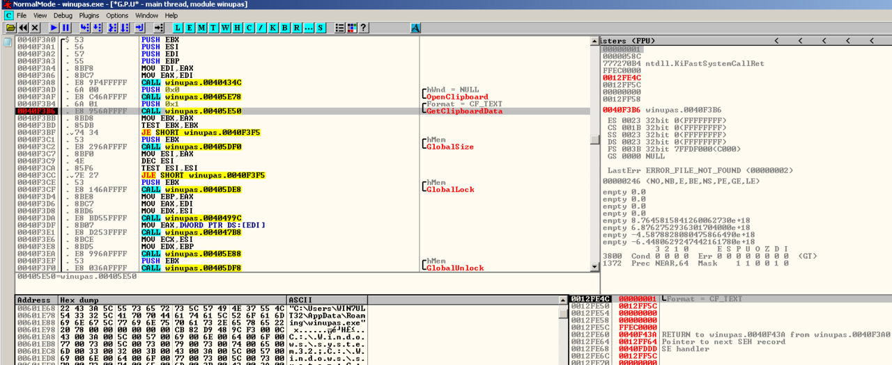 The second instance of Zeppelin enables the malware author to drop a version of Clipbanker in the %appdata%\local\temp directory and execute it as “winupas.exe”. This clipbanker is responsible for monitoring the system’s clipboard for any strings that matches a cryptocurrency address. If a match is identified, clipbanker will replace the string to that of the malware author’s cryptocurrency address so that any amount of cryptocurrency to be transferred will be redirected to the malware author’s address. After that, Zeppelin will create another instance of itself with “-agent 0” argument.