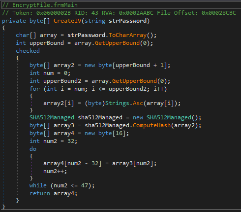 The encryption method uses Rijndael, the predecessor of AES. The encryption password is hardcoded. The encryption key is created by calculating a SHA512 hash of the password and using the first 32 bits of this hash (see left picture below). The IV creation is almost identical to the key, but it uses the next 16 bits (indices 32-47) of the same SHA512 hash (see right picture below).