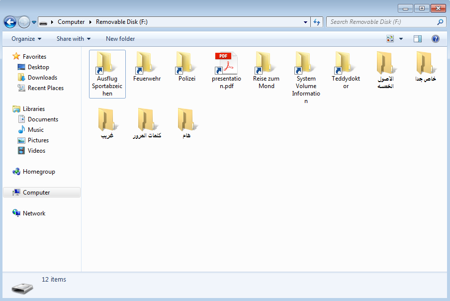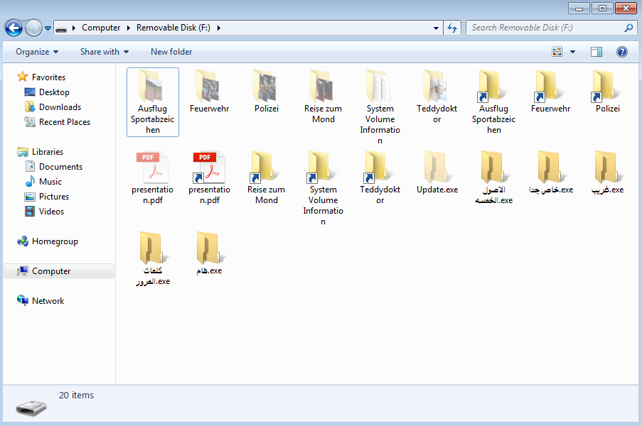 Unlike Spora there are tell-tale signs of the USB drive infection, like the arrow in the corner of the shortcut icons and the additional Arabic executables.