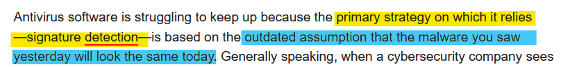 According to the media, antivirus products only search for patterns in files and compare file hashes to blocklists. These detection mechanisms are still there, but antivirus products have been using other malware detection technologies for at least two decades.