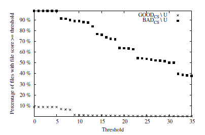 Zero was a terrible answer to work with because the detection rate plummeted as soon as I tried to get the false positive rate close to zero. The rate was never actually zero. I used 49,814 clean samples and 103,275 malicious samples for my tests. The picture on the right side shows the graph of false positive (crosses) and true positive (black squares) rates [p.107, hahn14]. E.g. at 8.81% false positive rate there is a 98.47% true positive detection rate [p.108, hahn14]. That means 8.81% of the clean files were erroneously assumed to be malware, whereas 1.53% of malware could not be detected. Keeping the false positive rate as low as possible still resulted in 0.17% of clean files receiving a wrong verdict. The downside of this approach was a reduced detection rate of only 37.80% detected malware files [p.109, hahn14].
