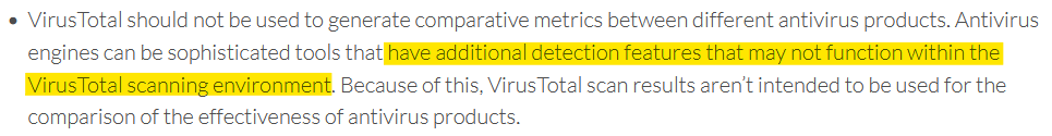 Secondly, people experiment with detections on VirusTotal thinking the scanning engines used there reflect the real antivirus products. If they perform small changes on a detected file and these result in lower detection rates on VirusTotal, they assume they could successfully evade antivirus products. This testing strategy is flawed because scanning engines on VirusTotal only support a fraction of the capabilities that the real products have and indeed mostly restrict themselves to pattern scanning and blocklisting of files, thereby giving people a false sense of how the full products actually work. This is also stated on VirusTotal's website (see image below).