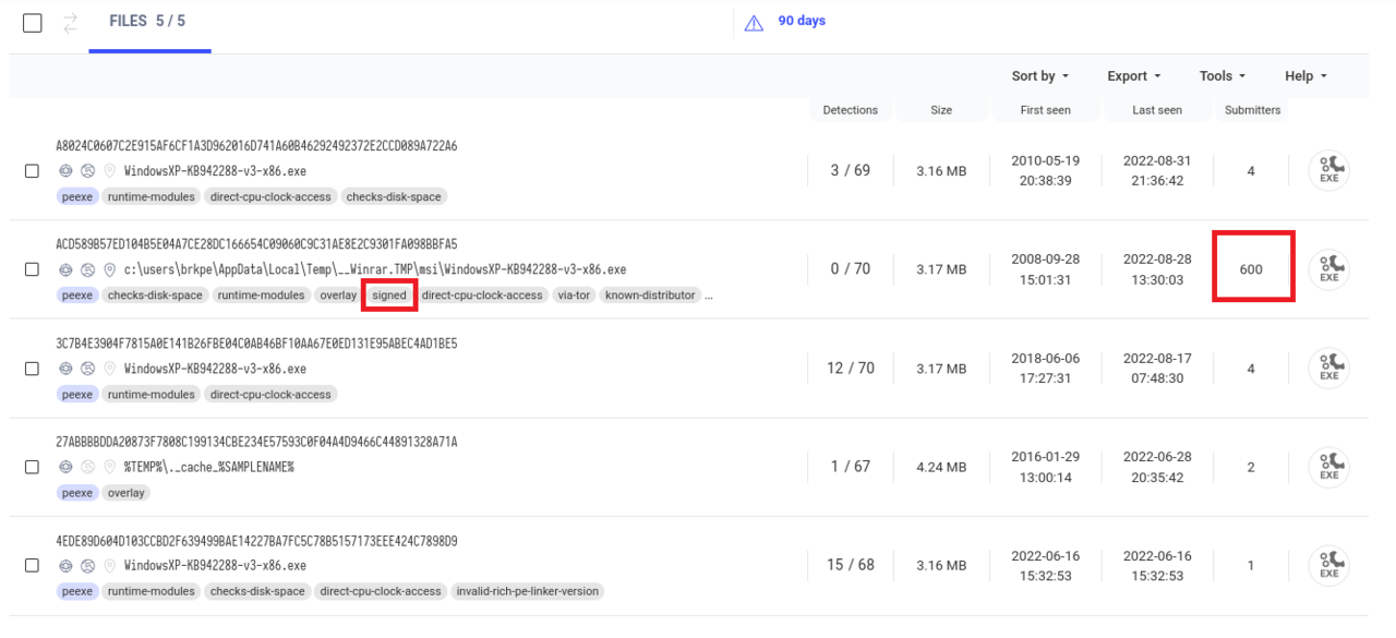 The result below shows one file with 600 submitters and four other files with less than five submitters each. The executable with 600 submitters is in stark contrast to the other files, indicating higher distribution numbers. Additionally this is the only validly signed file, so that we can conclude that the file with 600 submitters is most likely the original one.
