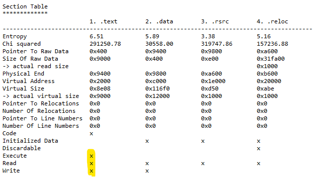 A prominent red flag for non-packed files is the presence of write and execute characteristics in a section, especially if that is the section containing the entry point. Most of the time write and execute characteristics do not appear together in a section in non-packed files, whereas it is rather typical for packed files. The presence of both means the code itself can be changed dynamically. The section characteristics are shown by PE parsers in the section table.