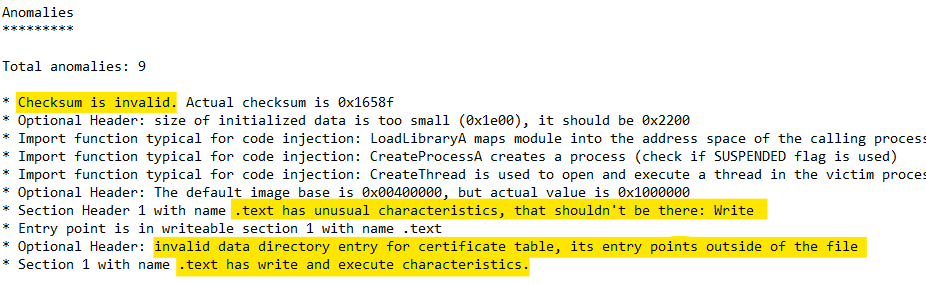 For truncated files, the section table may define sections whose raw pointer + size values point to somewhere beyond the end of the file. The data directory may point to structures outside of the file as well. Both are treated as anomalies in PortexAnalyzer reports.