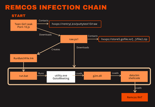 Some feature a slightly different execution chain than the previous one, e.g., the JScript file Teen Girl Leak Porn 10.js[7] whose name indicates that it targets porn consumers. The image below visualizes the infection chain for the this JScript file[7] and serves as an example for a different mode of execution.