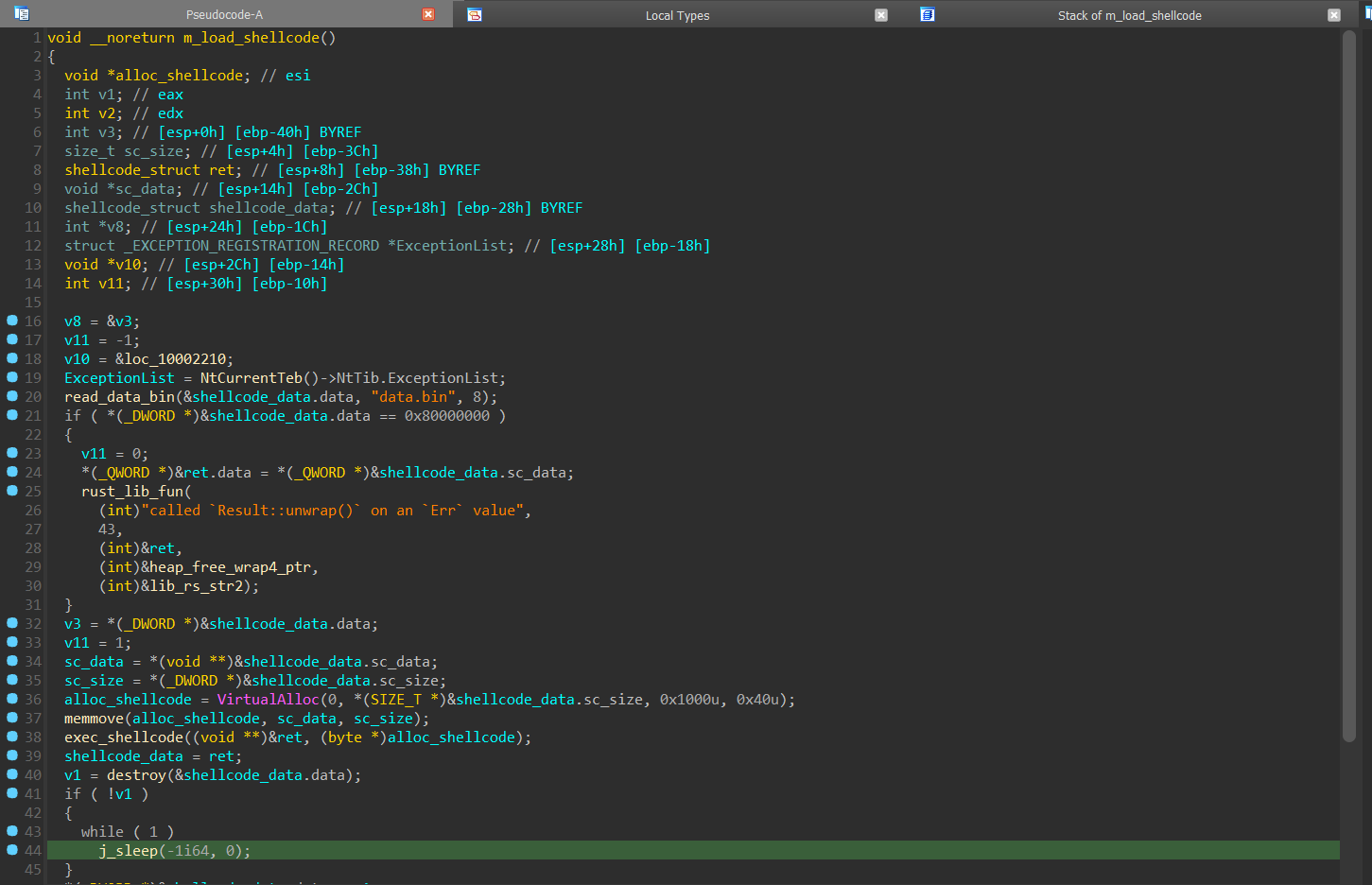 The Rust code reads the data.bin[2] file, allocates RWX memory for it and creates a new thread to execute it (see right image below).