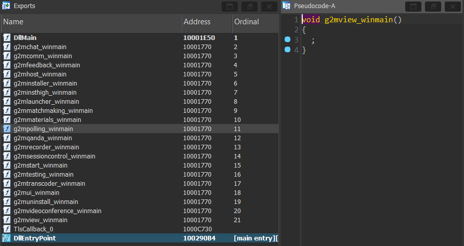 The malware DLL is written in Rust which is discernible by the statically linked Rust libraries. It exports 20 functions for GoTo Meeting but these all lead to the very same address with an empty function. Because the functions are not implemented, the GoTo Meeting executable cannot work, but the DLLMain of g2m.dll[4] will still run and allow the malware loader to execute.
