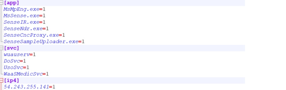 Windows Filtering Platform (WFP) is a set of system services and API that enables building network filtering applications. Applications with sufficient privileges can connect to the WFP engine through the API and manage filters for network traffic. The next payload deployed by the malware to %TEMP%\<random_name>.exe, does exactly that. The malware has an embedded configuration file which determines what filters are created. Filters are created to block outbound traffic from windows update related services (WuauServ, DoSvc, UsoSvc, WaasMedicSvc). This prevents Microsoft Defender from getting security intelligence updates and platform updates leaving the system vulnerable. Filters are also created to block out applications related to Microsoft Defender (MsMpEng.exe, MsSense.exe, SenseIR.exe, SenseNdr.exe, SenseCncProxy.exe, SenseSampleUploader.exe). This would blind the Microsoft Defender ATP and EDR platforms as detection and telemetry data would not be sent to the cloud from the victim machine.