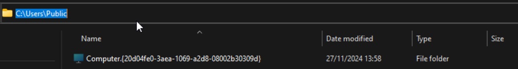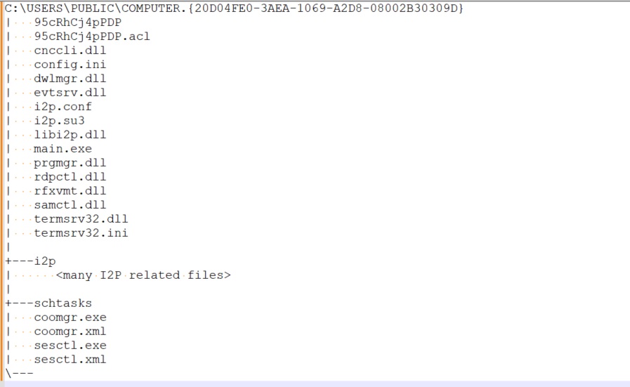 The loader then deploys the RAT installer to %TEMP%\<random_name>.exe and executes it. The component is around 10MB in size and has multiple components of the RAT malware embedded within it in encrypted form. On execution, the malware creates the directory C:\users\Public\Computer.{20d04fe0-3aea-1069-a2d8-08002b30309d} to store the RAT components. When a directory is created with this name, the operating system treats it akin to a shortcut to “My Computer”. Therefore, the contents of the directory cannot be examined in a straightforward manner. The trick helps to hide and make the malware files inaccessible.