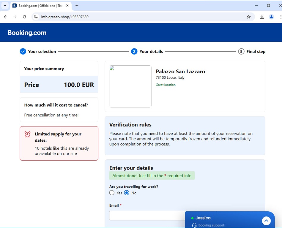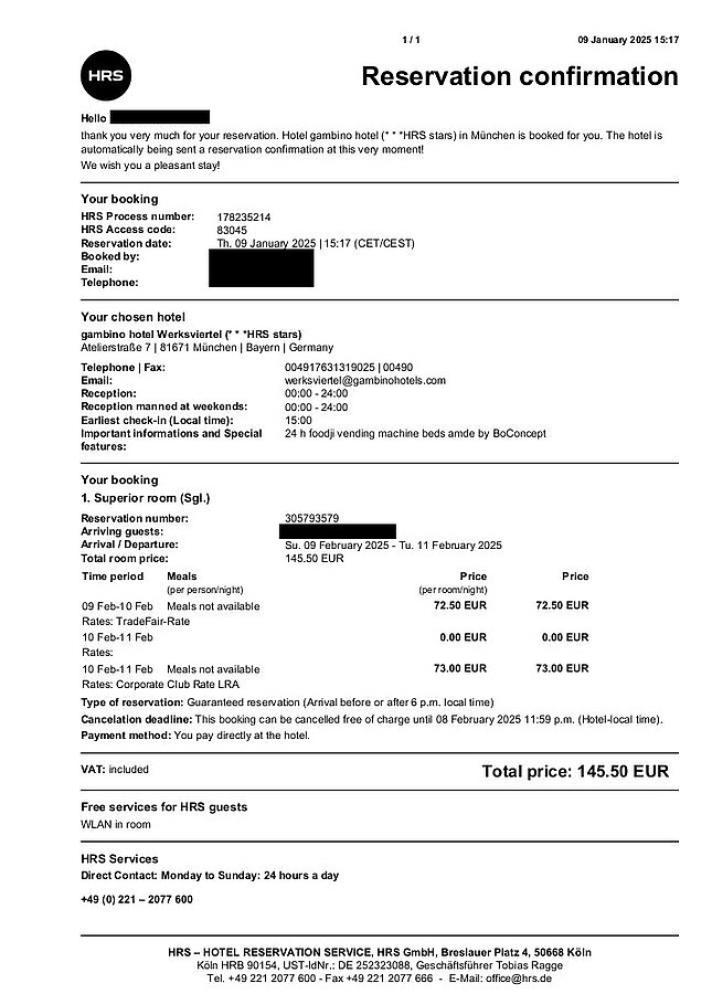 During our investigation, the fake booking webpage displayed two different PDFs that show booking confirmation details that are modeled after the platforms of booking.com and hrs.com