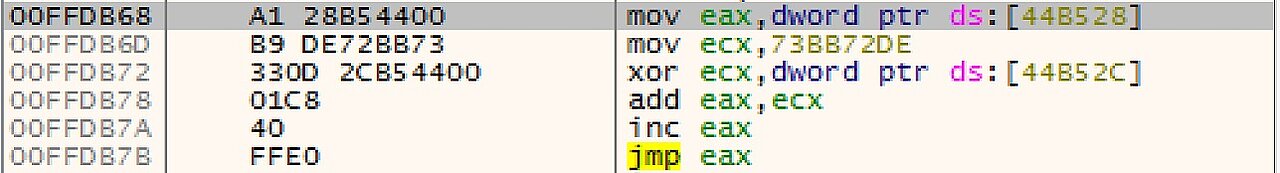 Here is a snippet of a Dispatcher Blocks found inside the sample (SHA256: 7b3bd767ff532b3593e28085940646f145b9f32f2ae97dfa7cdd652a6494257d )